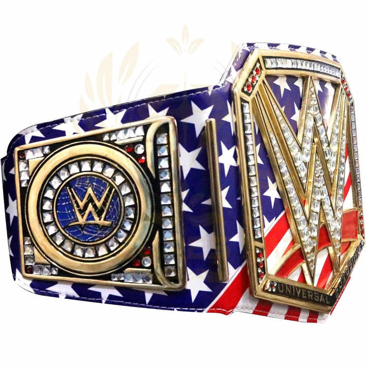 Crafted with 100% synthetic leather and featuring colorful hand-painted center plates with metal side plates, this custom-made championship belt combines durability and style. The thick brass plates are dual gold-plated with a 4mm plate thickness, offering a premium finish. With a buckle style closure and snap feature, the belt is 50″ long and weighs 5.5 lbs. It includes a black velvet zippered sleeve for protection. Custom colors, sizes, and designs are available,